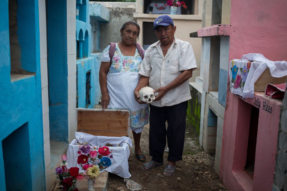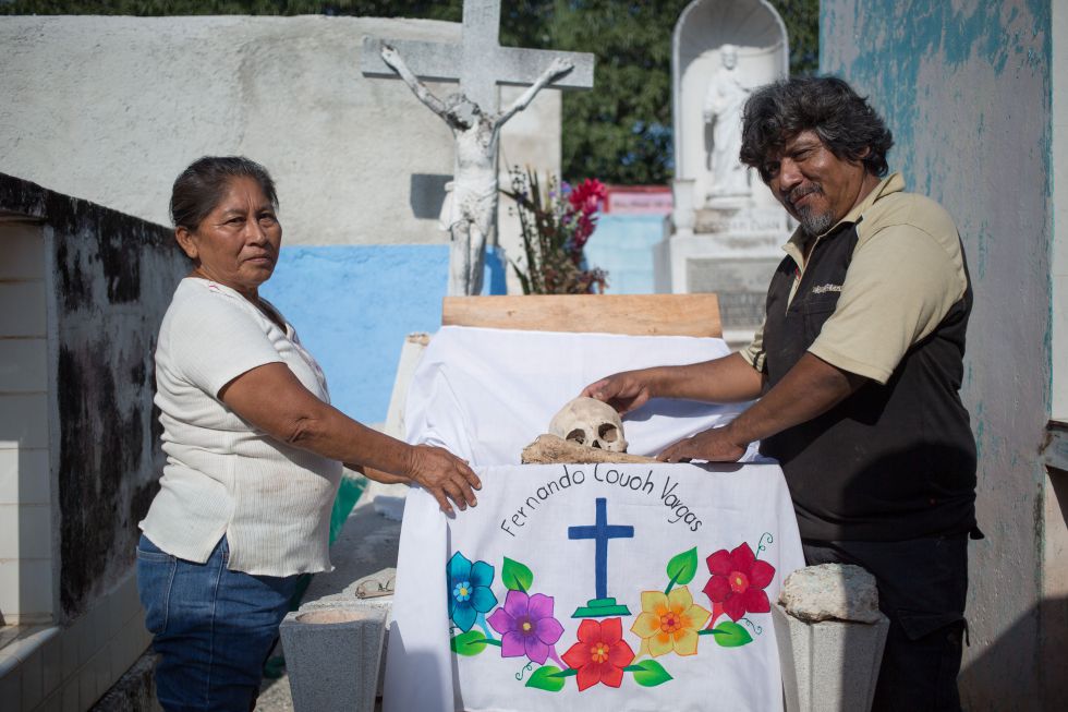 Maria Eliza Chaan Chi y Aurelio Kan Tuz limpian los restos del padre de la señora María.