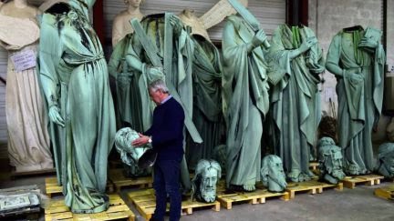 Patrick Palem, experto en restauración, sostiene la cabeza de una de las estatuas que formaban parte de Notre Dame y se quitaron para su restauración.