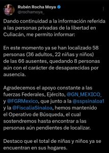 CULIACÁN, Sin.- El total de los niños secuestrados en Culiacán ya fueron liberados, informó este domingo el gobernador Rubén Rocha Moya, en un mensaje público en sus redes sociales.