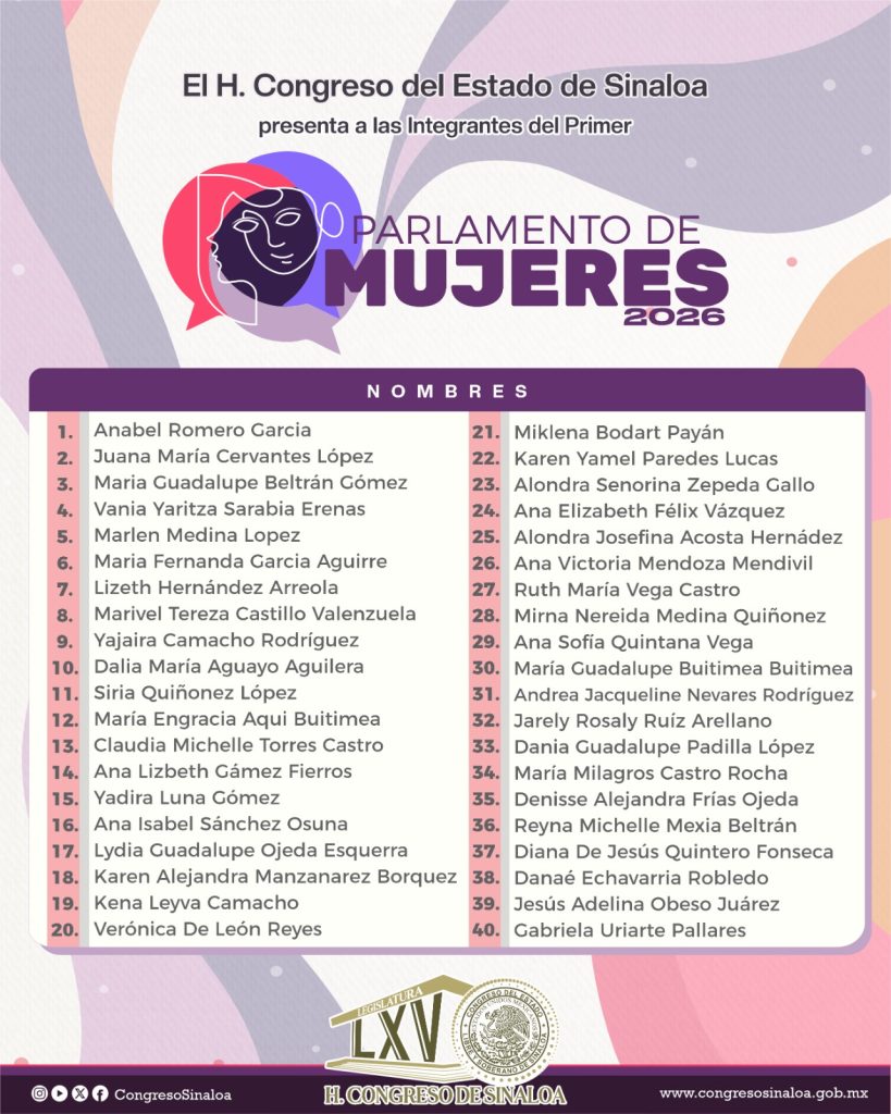 CULIACÁN, Sin.- La Junta de Coordinación Política (JUCOPO) y la Comisión de Igualdad, Género, Diversidad Sexual e Inclusión, del Congreso del Estado de Sinaloa, integradas en Jurado del Parlamento de Mujeres, eligieron por unanimidad, este viernes 20 de marzo, a las 40 mujeres que durante dos días (26 y 27 de marzo) formarán parte del primer Parlamento de Mujeres.