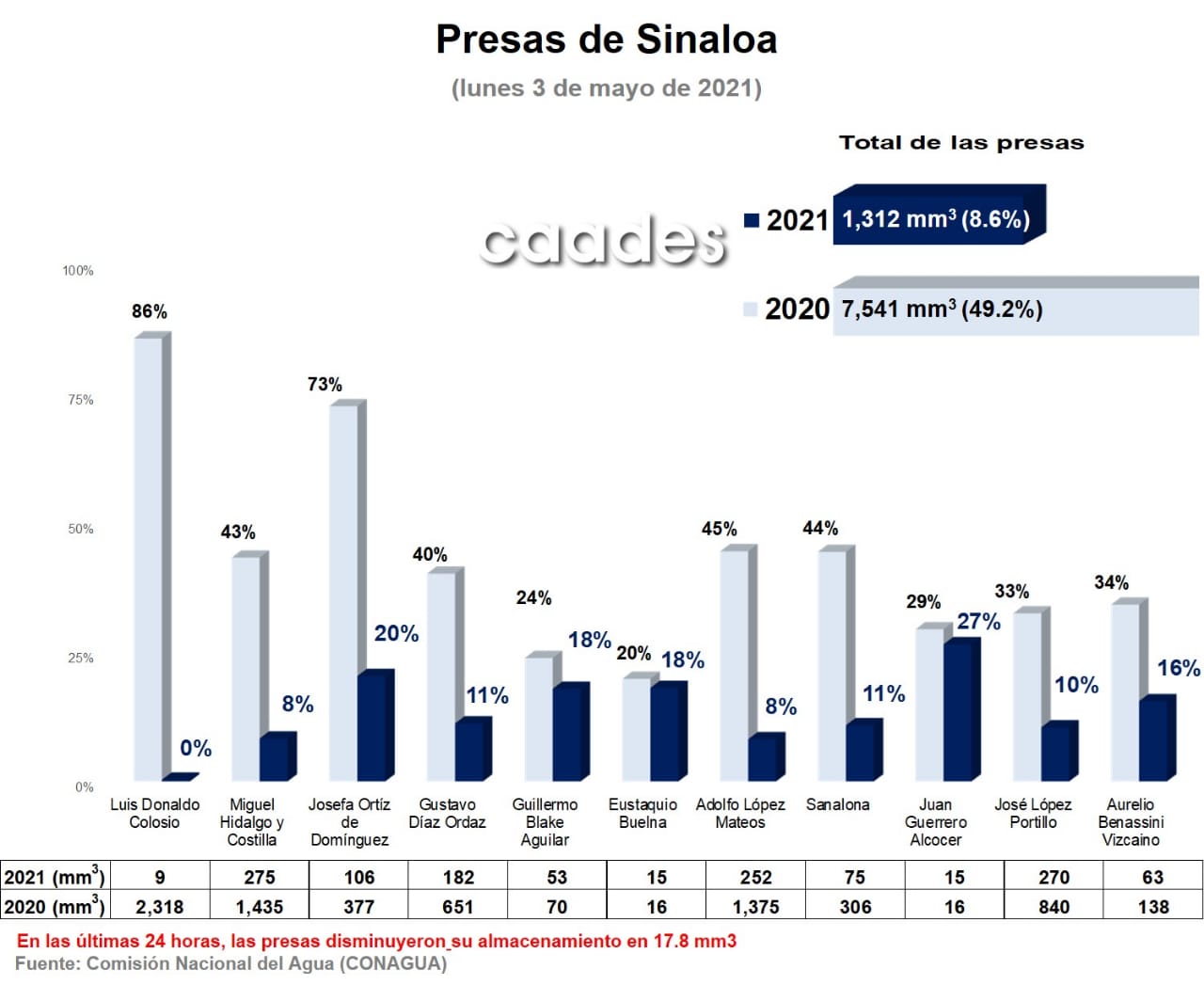 CULIACÁN, Sin.- Este lunes el almacenamiento de las presas en Sinaloa es de 1,312 mm3, lo que significa que sólo tienen 8.6 por ciento del total de su capacidad.