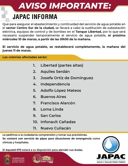 CULIACÁN, Sin.- Este miércoles se suspende temporalmente el servicio de agua potable a 11 colonias que se abastecen de este sistema de bombeo.