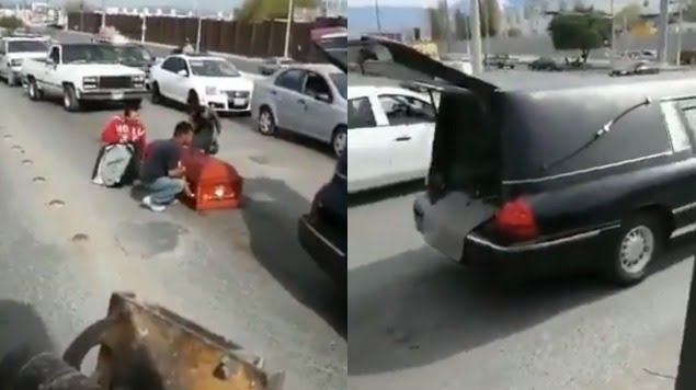 SALTILLO, Coahuila.- Usuarios en redes sociales difundieron videos del momento en que un ataúd se sale de una carroza fúnebre en Saltillo y cae en plena calle.