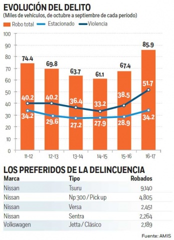 En México cada hora se roban 10 autos, seis de los cuales son despojados a sus propietarios con violencia, de acuerdo con el último reporte de la Asociación Mexicana de Instituciones de Seguros (AMIS).