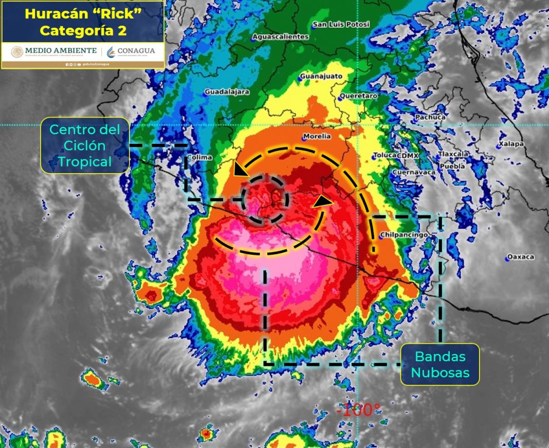 CIUDAD DE MÉXICO.- El centro del huracán “Rick” de categoría 2 en la escala de Saffir-Simpson, se localiza en tierra en las inmediaciones del municipio de Arteaga, Michoacán.