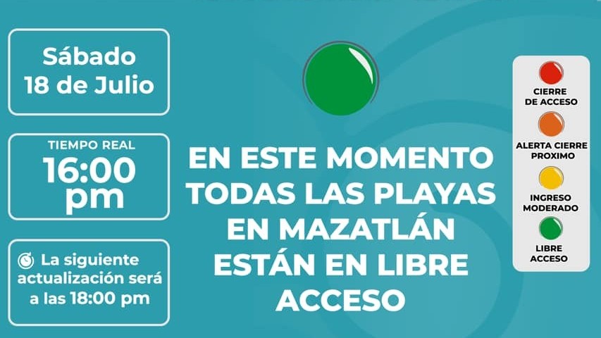 MAZATLÁN, Sin.- A las 16:00 horas de este sábado el semáforo de playas marca el “verde”, lo que significa acceso libre a las 30 playas del puerto.