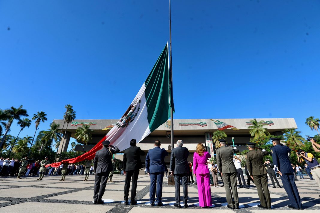 CULIACÁN, Sin.- En conmemoración del 214 aniversario del Inicio de la Guerra de Independencia, el Gobernador Rubén Rocha Moya, encabezó la ceremonia de izamiento de bandera a toda asta con Honores de Ordenanza, acompañado del gabinete y funcionarios estatales.
