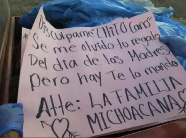Los cuerpos presentaban signos de tortura e impactos de bala, y se encontraban en la batea de la camioneta, envueltos en una lona y encima una cartulina con un mensaje escrito por parte de la familia michoacana.