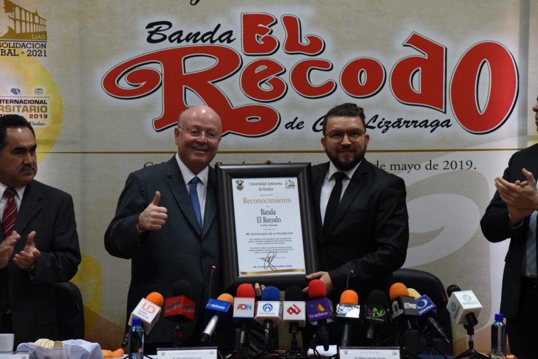 CULIACÁN, Sin.- La Universidad Autónoma de Sinaloa (UAS) entregó un merecido reconocimiento a la conocida como la “Madre de todas las bandas”, Banda El Recodo de Cruz Lizárraga, para agradecer la difusión cultural y el rescate de las tradiciones al llevar la música por todo el mundo a lo largo de ocho décadas que este año están cumpliendo.