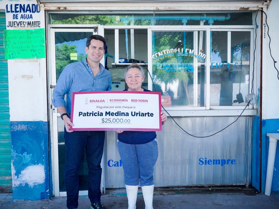 VILLA JUÁREZ, Sin.- El secretario de Economía, Javier Gaxiola Coppel visitó a la señora Patricia Medina Uriarte, propietaria del negocio de agua purificada “Oasis”, quien fue beneficiada con un microcrédito de Red Fosin.