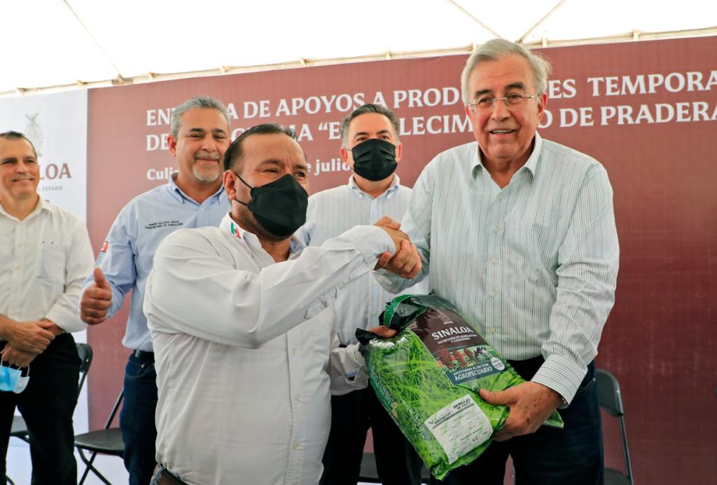 CULIACÁN, Sin.- Para apoyar a los productores de temporal, el gobernador Rubén Rocha Moya entregó un primer paquete de 5 mil bolsas de semilla para forrajes y sorgo, que beneficiarán a los primeros 2 mil 500 productores de los municipios de Elota, Badiraguato y Culiacán, quienes recibieron este apoyo de manera gratuita, como parte de una inversión estatal de 30 millones de pesos.