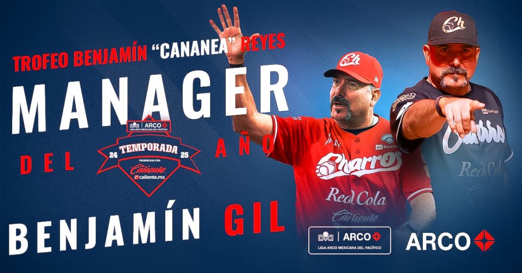 CULIACÁN, Sin.- Por segundo año consecutivo y también por segunda ocasión en su carrera, el timonel de los Charros de Jalisco, Benjamín Gil, gana el Trofeo llamado “Benjamín ‘Cananea’ Reyes” al Manager del Año, por lo hecho en el rol regular de la Temporada 2024-2025 en la Liga Mexicana del Pacífico.