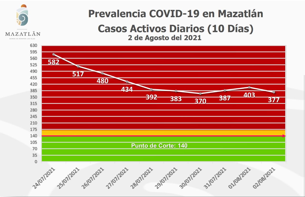 A nivel estatal, el puerto se mantiene en color rojo del Semáforo Epidemiológico Estatal y en la tercera posición en Sinaloa, superado sólo por los municipios de Culiacán y Ahome, que al día de hoy presentan mil 342 y 584 casos activos respectivamente.