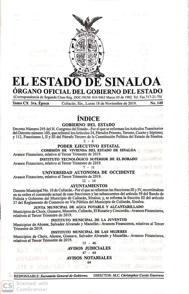 CULIACÁN, Sin.- Con fecha lunes 18 de noviembre de 2019, fueron publicadas en el Periódico Oficial del Estado de Sinaloa, las reformas a las fracciones III y IV del artículo 59 del Bando de Policía y Gobierno; y a la fracción III del artículo 37 del Reglamento de Comercio en la Vía Pública; en las que se prohíbe la venta, compra, posesión y manipulación de pirotecnia en la vía pública, estableciendo estas conductas como faltas administrativas agravadas.