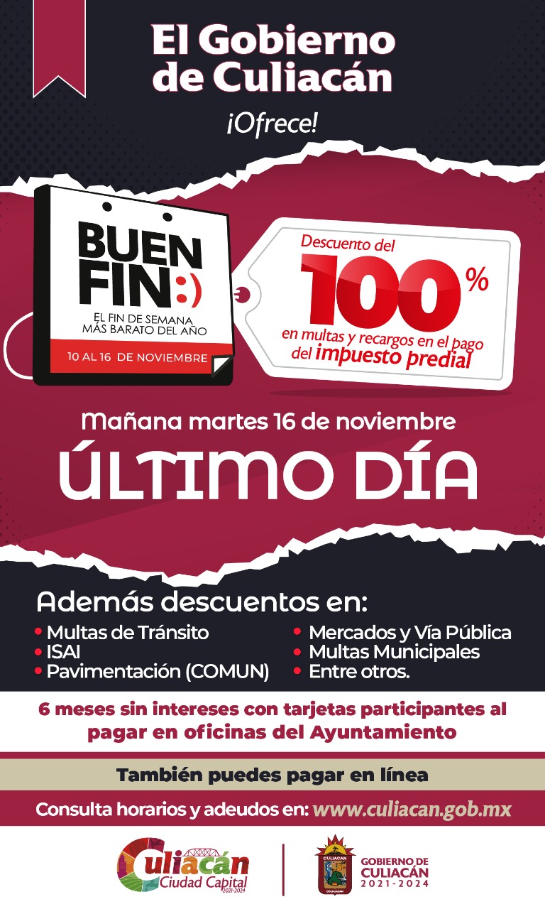 CULIACÁN, Sin.- Este martes es el último día para el descuento al 100 por ciento de multas y recargos en materia de impuesto predial en el municipio de Culiacán.