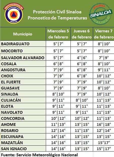CULIACÁN, Sin.- La presencia del Frente Frío No. 38 se extiende sobre el noroeste y norte de México, mientras que la octava tormenta invernal de la temporada se localiza al suroeste de Estados Unidos provocando un descenso en las temperaturas en el estado de Sinaloa.
