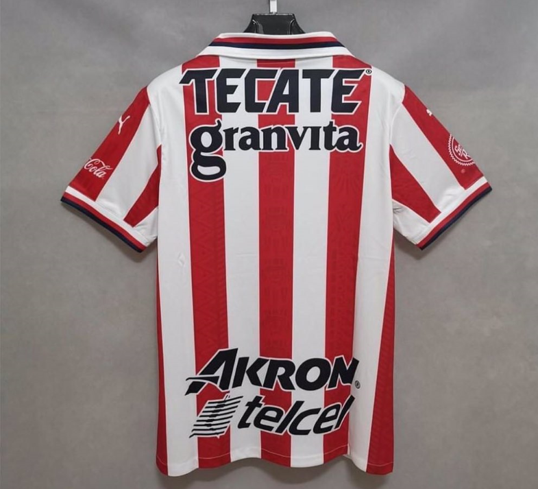 En la parte posterior de la camiseta, Chivas presenta a cuatro patrocinadores y uno más en la manga derecha.