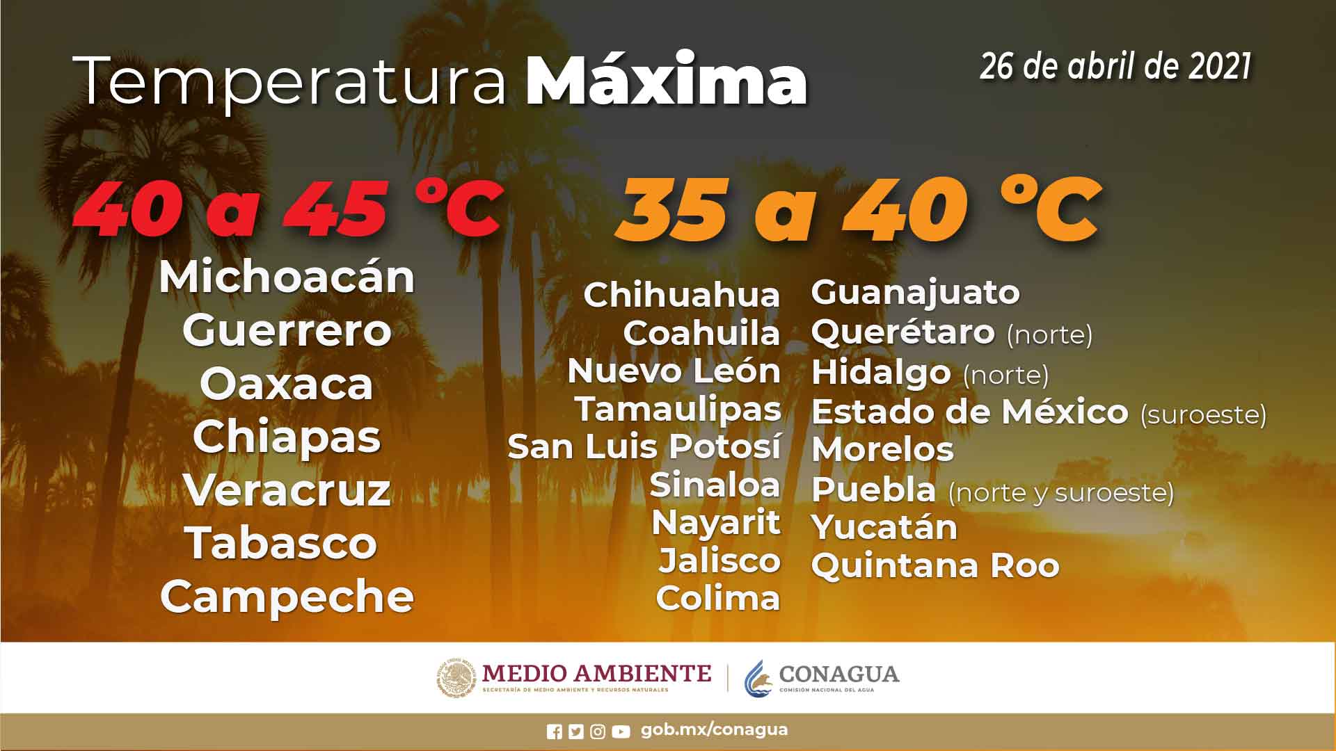 Ambiente frío al amanecer en zonas serranas de Sonora y cálido a caluroso por la tarde sobre costas. Viento del sur y suroeste de 20 a 35 km/h en la región, con rachas de 80 a 100 km/h y tolvaneras en Sonora.