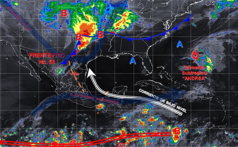 El frente No. 58 con características de estacionario se localizara sobre el noreste del país, en interacción con la corriente de vientos máximos, originarán rachas de viento superiores a 70 km/h con posibles tolvaneras y/o torbellinos en el norte y noreste del país, así como tormentas de corta duración y posibles granizadas en dichas regiones.