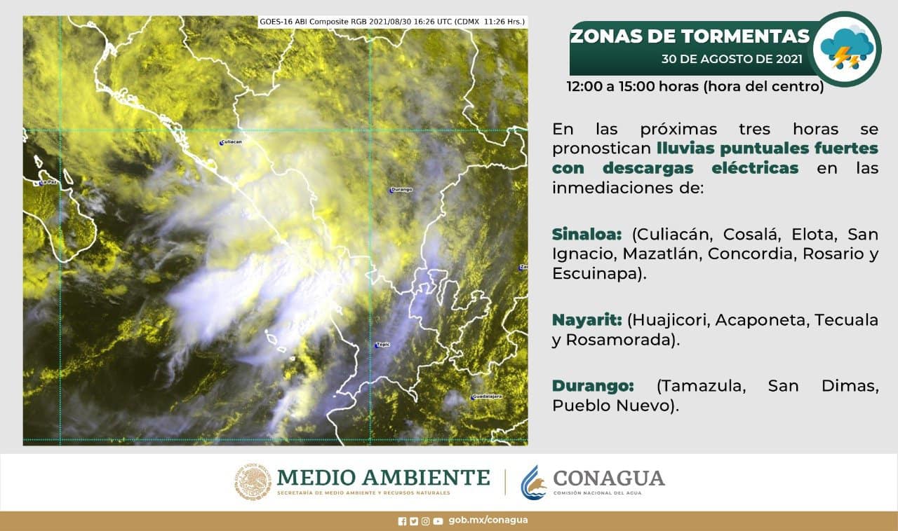 CULIACÁN, Sin.- En las próximas horas se prevén lluvias puntuales fuertes en Culiacán, Cosalá, Elota, San Ignacio, Mazatlán, Concordia, El Rosario y Escuinapa.