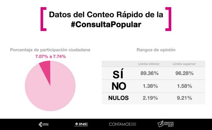 CIUDAD DE MÉXICO.- El porcentaje de participación ciudadana y rangos de opinión que arrojó el Conteo Rápido de la Consulta Popular de este domingo fue de entre 7 y 7.7%.