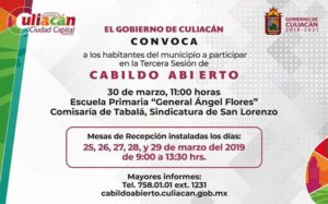 CULIACÁN, Sin.- El gobierno de Culiacán 2018-2021 convocó a su tercera edición de Cabildo Abierto que se llevará a cabo el próximo 30 de marzo en la comisaría de Tabalá, sindicatura de San Lorenzo.