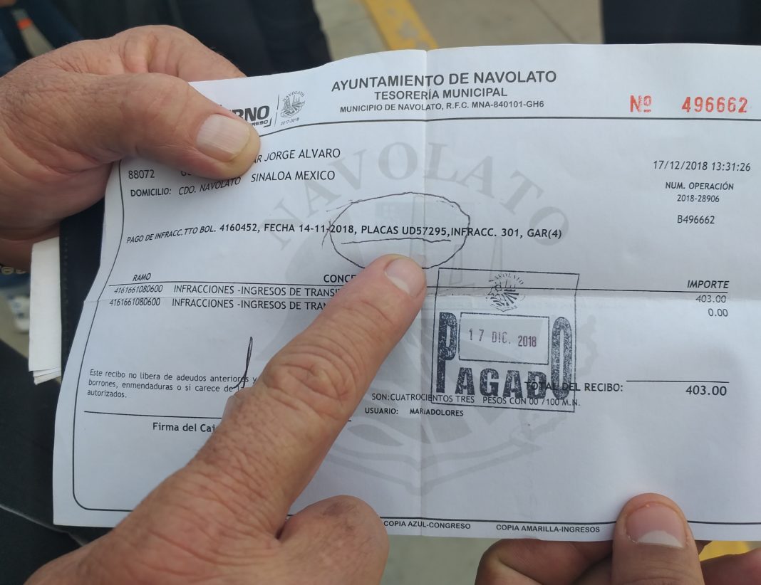 NAVOLATO, Sin.- A menos de 30 días de declarar “cero tolerancia” en multas por violaciones a la ley de tránsito el Alcalde de Navolato Eliazar Gutiérrez Angulo, mostró la boleta de pago de infracción de uno de tres funcionarios de su gobierno que han sido multados.
