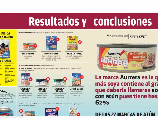 CIUDAD DE MÉXICO.- La Procuraduría Federal del Consumidor (Profeco) informa que con la propuesta de modificación a la NOM-084-SCFI-1994 lo que se pretende es que se informe al consumidor el contenido de soya en una presentación de atún y que se precise la denominación del producto a “Atún con soya” o “Soya con atún”, en los casos que lo ameriten.