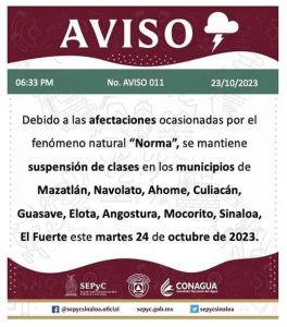 CULIACÁN, Sin.- Este martes se mantiene la suspensión de clases para 10 municipios de Sinaloa, informó la Secretaria de Educación Pública y Cultura.