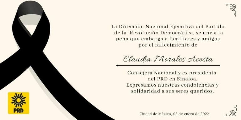 CULIACÁN, Sin.- La exdirigente del PRD en Sinaloa, Claudia Morales Acosta, falleció a los 66 años de edad, informó el partido del sol azteca.