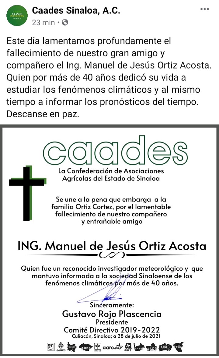 CULIACÁN, Sin.- Este miércoles falleció víctima del COVID-19, Manuel de Jesús Ortiz Acosta, el meteorólogo de la Confederación de Asociaciones Agrícolas del Estado de Sinaloa.