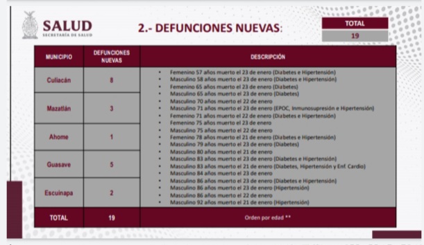 CULIACÁN, Sin.- Sinaloa registró este martes 19 muertos por COVID-19, la cifra más en decesos en un solo día en lo que va de la cuarta ola por la pandemia de esta enfermedad.