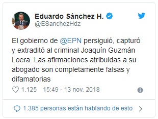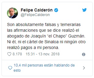 No sólo negó la Presidencia los dichos por la defensa del capo, sino que el expresidente Felipe Calderón también hizo lo propio: “Son falsas y temerarias las afirmaciones que, se dice, realizó el abogado de Joaquín “el Chapo” Guzmán”, dijo.