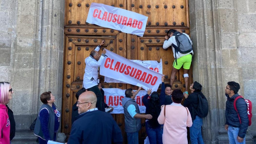 Los inconformes pegaron varios sellos con la frase “clausurado” en la puerta central del inmueble donde despacha el presidente Andrés Manuel López Obrador.