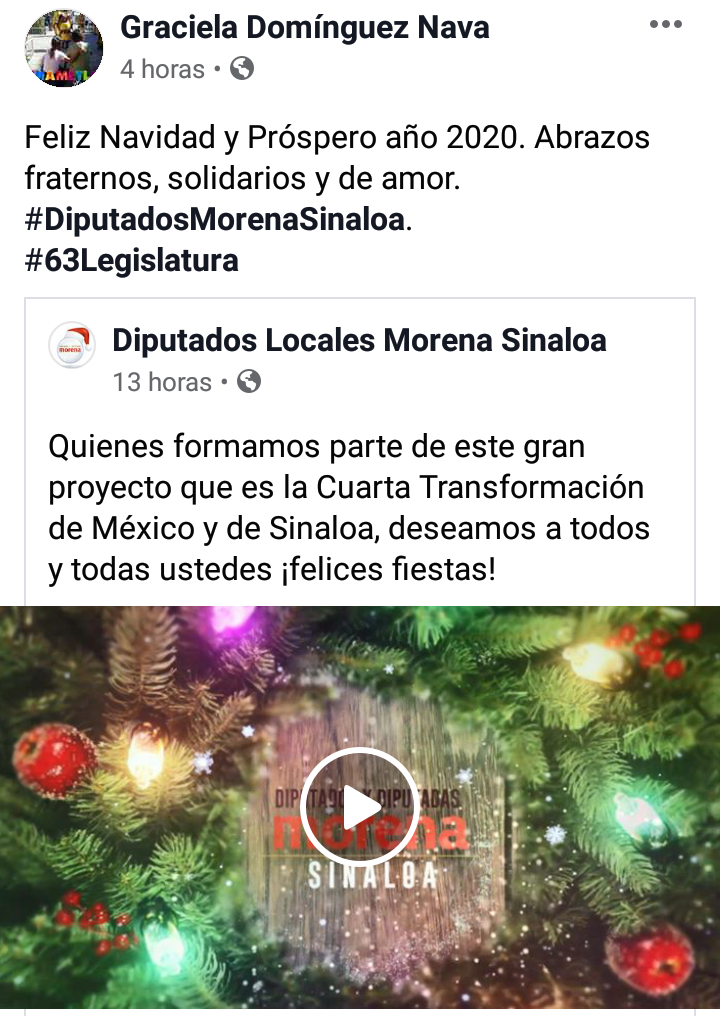 A estas iniciativas de fin de año se unió la presidenta de la Junta de Coordinación Política del Congreso de Sinaloa, Graciela Domínguez Nava, enviando un mensaje en video a nombre de los diputados locales de su partido (Morena) en Sinaloa.