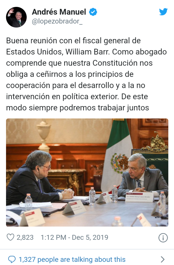 Asimismo, el miércoles adelantó que la introducción de armas y dólares a México serían los temas a tratar con William Barr. Asimismo, afirmó que su gobierno no permitirá ningún operativo como el de “Rápido y Furioso”, que se realizó en el sexenio de Felipe Calderón en conjunto con la Agencia de Alcohol, Tabaco, Armas de Fuego y Explosivos de Estados Unidos (ATF).