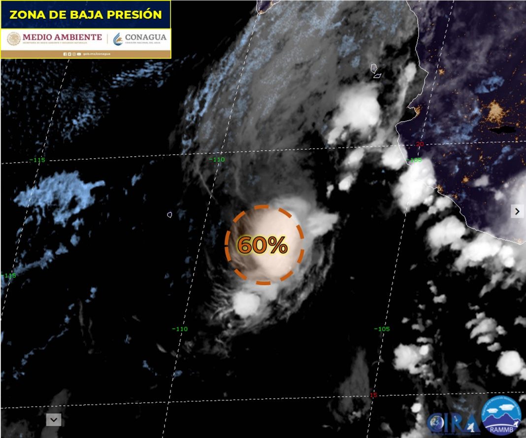 CIUDAD DE MÉXICO.- Una zona de baja presión mantiene 60 por ciento de probabilidad de desarrollo ciclónico en 48 horas, se ubica al oeste-suroeste de las costas de Jalisco.