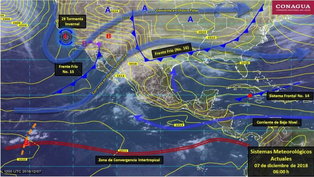 Por su parte, el nuevo frente frío número 16 comenzará a ingresar sobre el norte y noreste de México, interactuando con la segunda tormenta invernal y con la corriente en chorro, lo que originarán potencial de tormentas fuertes en esas regiones.