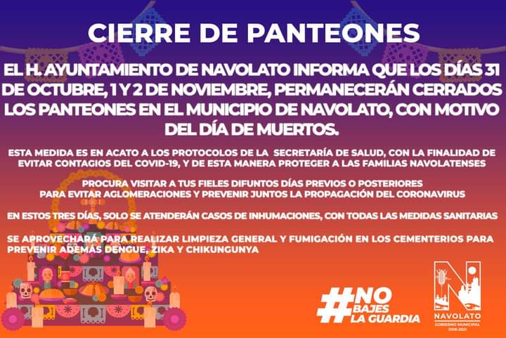 NAVOLATO, Sin.- El gobierno de Navolato informó que este 31 de octubre, 1 y 2 de noviembre los panteones del municipio serán fumigados contra el mosco Aedes Aegypti, portador del dengue, zika y chikungunya.