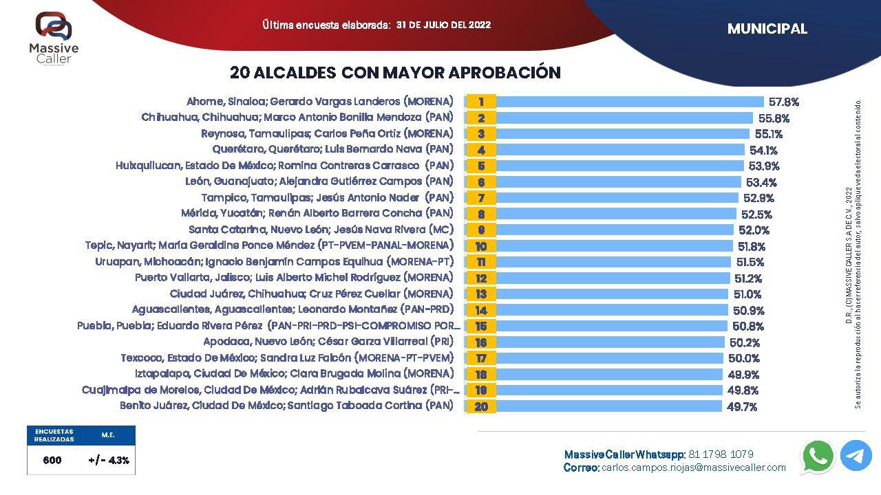 Fue con el 57.8% de personas encuestadas que Gerardo Vargas se colocó en la posición uno de los alcaldes con mayor aprobación, seguido de Marco Antonio Bonilla Mendoza, alcalde de Chihuahua, con el 55.8%, mientras que la tercera posición se encuentra Carlos Peña Ortiz, alcalde de Reynosa, quien recibió el 55.1%.