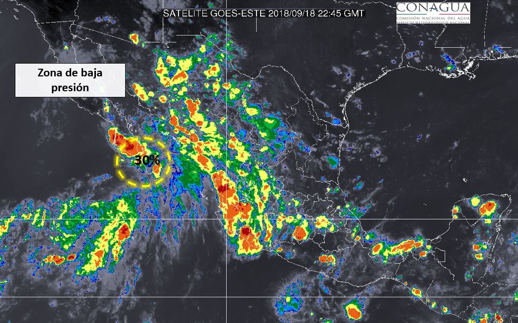 CIUDAD DE MÉXICO.- La zona de baja presión con 30 por ciento de potencial para desarrollo ciclónico en las próximas 48 horas se localiza en tierra sobre el extremo sur de Baja California Sur.