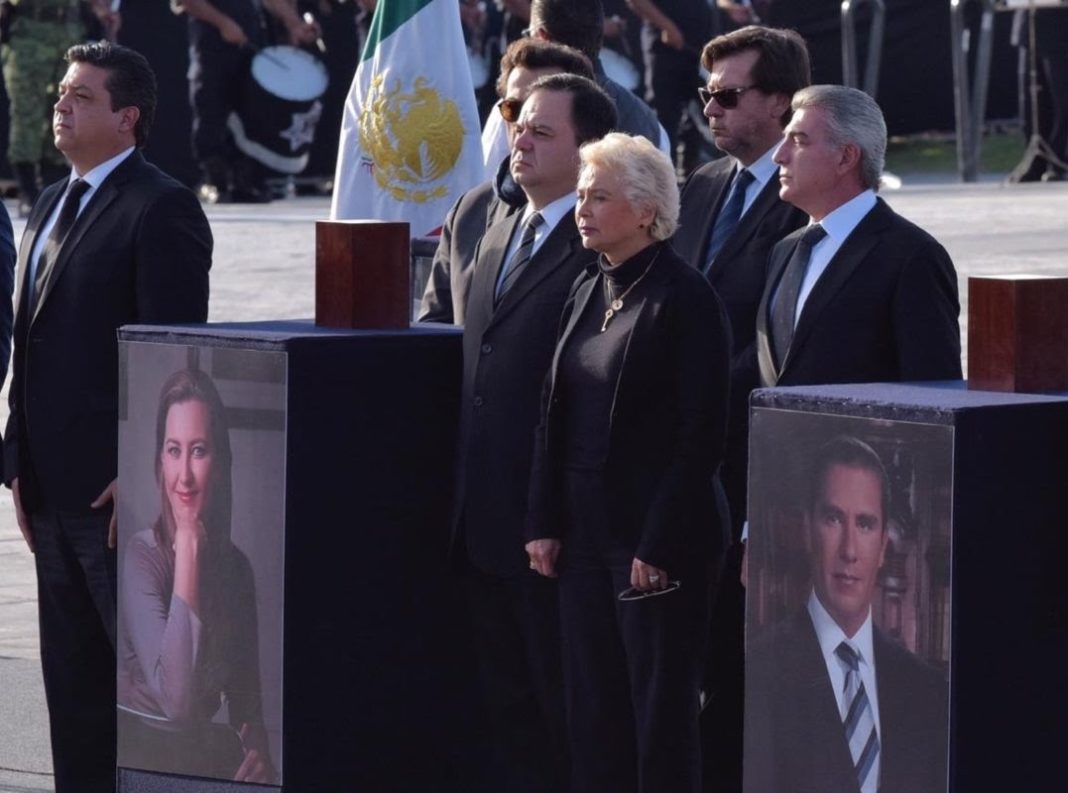Olga Sánchez Cordero, titular de Gobernación, encabezó la primera guardia de honor, en medio de reclamos como “justicia” y “fuera”, flanqueada por el exgobernador José Antonio Gali Fayad y Jesús Rodríguez Almeida, encargado de despacho de Puebla tras el accidente.