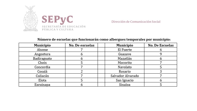 CULIACÁN, Sin.- Ante la actual temporada de lluvias y huracanes, y en atención a las y los ciudadanos que lo requieran, un total de 105 escuelas del estado de Sinaloa serían habilitadas como albergues temporales.