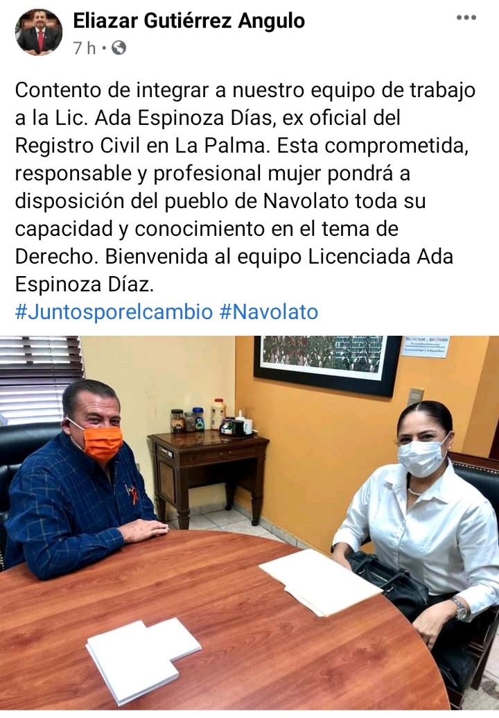 En su cuenta de Facebook, el alcalde de Navolato, Eliazar Gutiérrez Angulo, manifestó su respaldo a la funcionaria, cuya incorporación será formalizada la quincena próxima y el cargo a ocupar está en definición.
