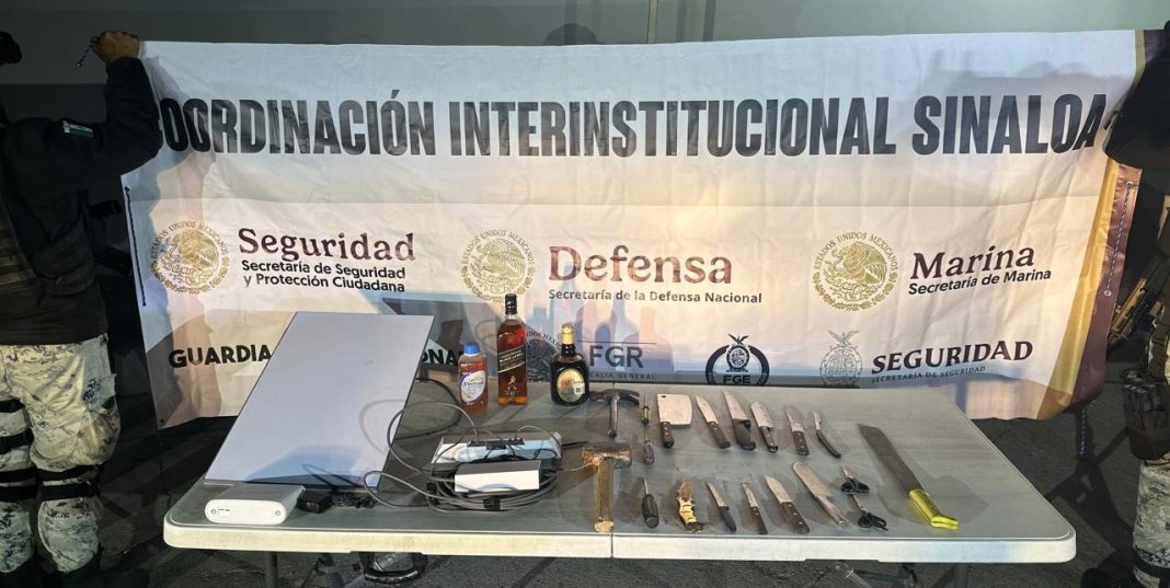 Durante las primeras horas de este miércoles 5 de febrero, la Secretaría de Seguridad Pública de Sinaloa, a través de la Policía Estatal Preventiva y con la colaboración de la seguridad periférica proporcionada por la Secretaría de la Defensa Nacional y la Guardia Nacional, llevó a cabo una inspección en el penal de Aguaruto, ubicado en la capital del estado, obteniendo como resultado la localización y aseguramiento de tres botellas que contenían bebidas alcohólicas, así como un módem, un sistema Starlink, 10 cuchillos, un machete, una navaja y dos tijeras, además de tres desarmadores y dos martillos.