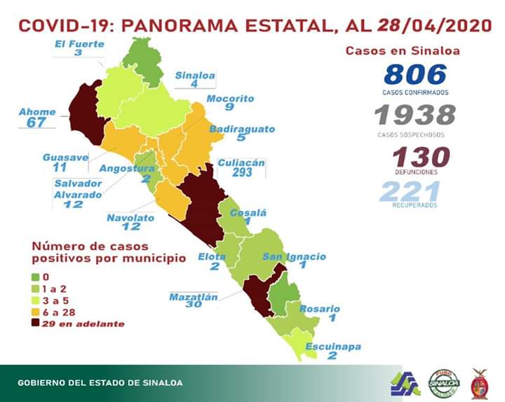 Recuperados: 221 (49 nuevas: 33 Culiacán, 7 Ahome, 3 Guasave, 3 Mazatlán, 1 Salvador Alvarado, 1 Escuinapa, 1 Badiraguato)
