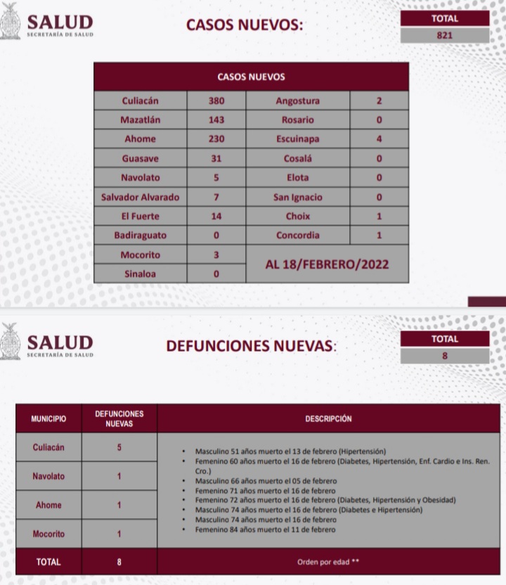 CULIACÁN, Sin.- Sinaloa registró 975 nuevos contagios por COVID-19 y 8 defunciones este viernes, reportó la Secretaría de Salud.