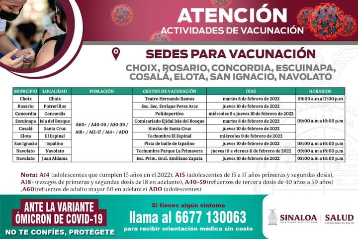CULIACÁN, Sin.- Esta semana la Secretaría de Salud programó una serie de sedes para la vacunación desde jóvenes a adultos mayores en los 18 municipios.