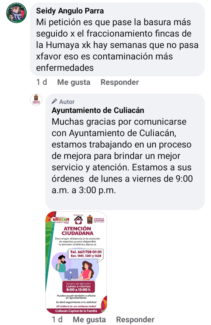 A esta petición, le respondió de manera posterior el ayuntamiento de Culiacán refiriéndola al departamento de Atención Ciudadana argumentando que están trabajando en un proceso de mejora.