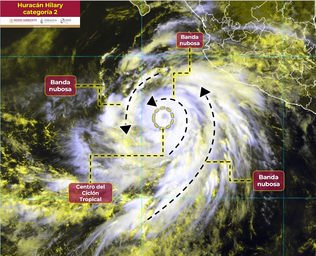CIUDAD DE MÉXICO.- Hilary ahora como huracán de categoría 2, sus extensas bandas nubosas ocasionan lluvias de fuertes a puntuales intensas en estados del occidente, centro y sur de México.
